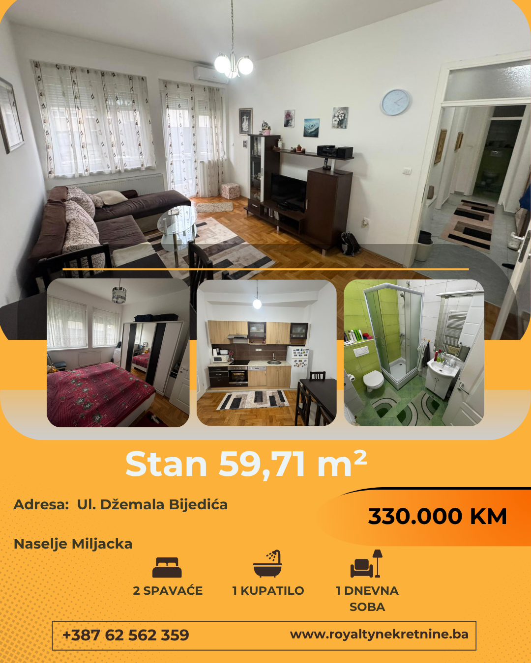 Na prodaju moderan i funkcionalan stan površine 59,72 m², smješten u atraktivnom naselju Miljacka, na adresi Džemala Bijedića 160.
